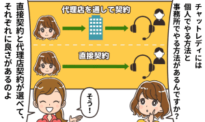 [voice icon=”https://chatlady-atoz.com/wp-content/uploads/2020/09/ico_a_05.png” name=”あおいさん” type=”r woman2″]私も事務所でやっていたときはスタッフの人に相談に乗ってもらったり、女性だけの環境だったから安心して通うことができたの。かなちゃんも信頼できる事務所を探してみてね[/voice]