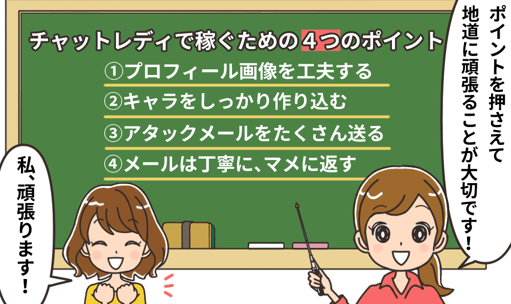 [voice icon=”https://chatlady-atoz.com/wp-content/uploads/2020/09/ico_a_04.png” name=”あおいさん” type=”r woman2″]コツを覚えておくとスムーズに稼げるようになるわ!ぜひチェックしてね[/voice]