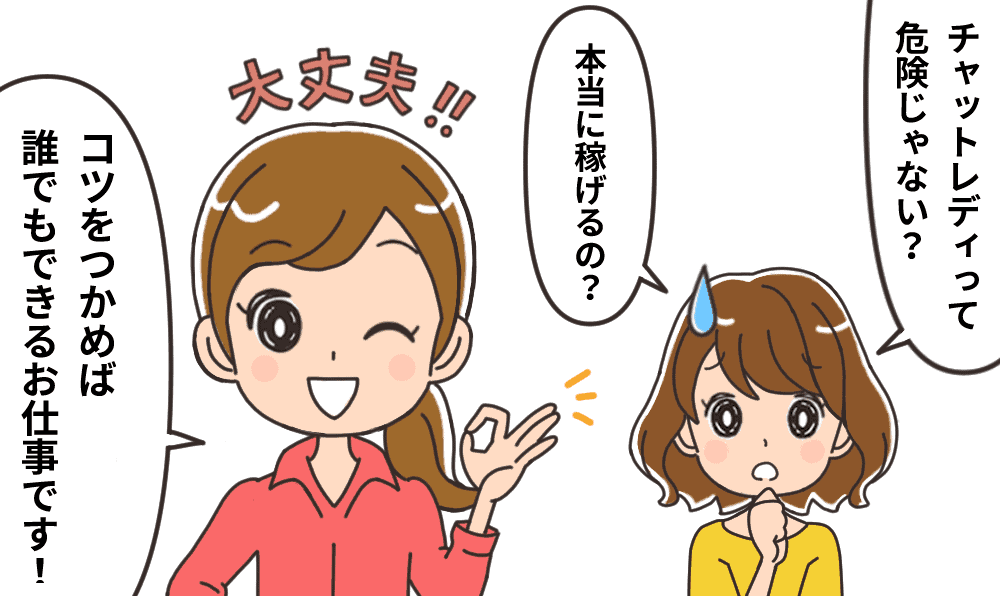 [voice icon="https://chatlady-atoz.com/wp-content/uploads/2020/06/ico_k_02.png" name="かなちゃん" type="l woman"]チャットレディって危険じゃない?本当に稼げるの?[/voice] [voice icon="https://chatlady-atoz.com/wp-content/uploads/2020/09/i...